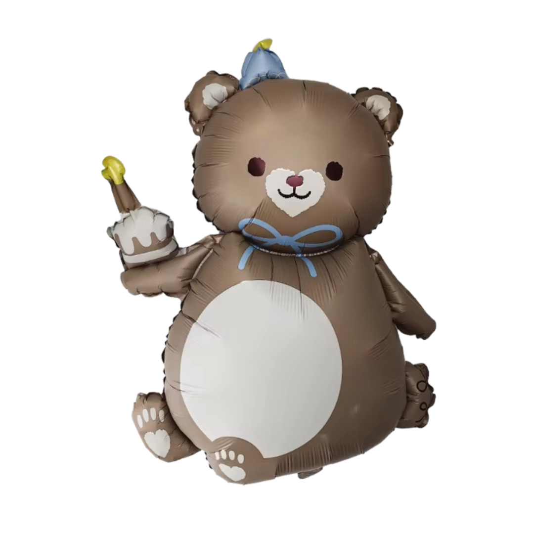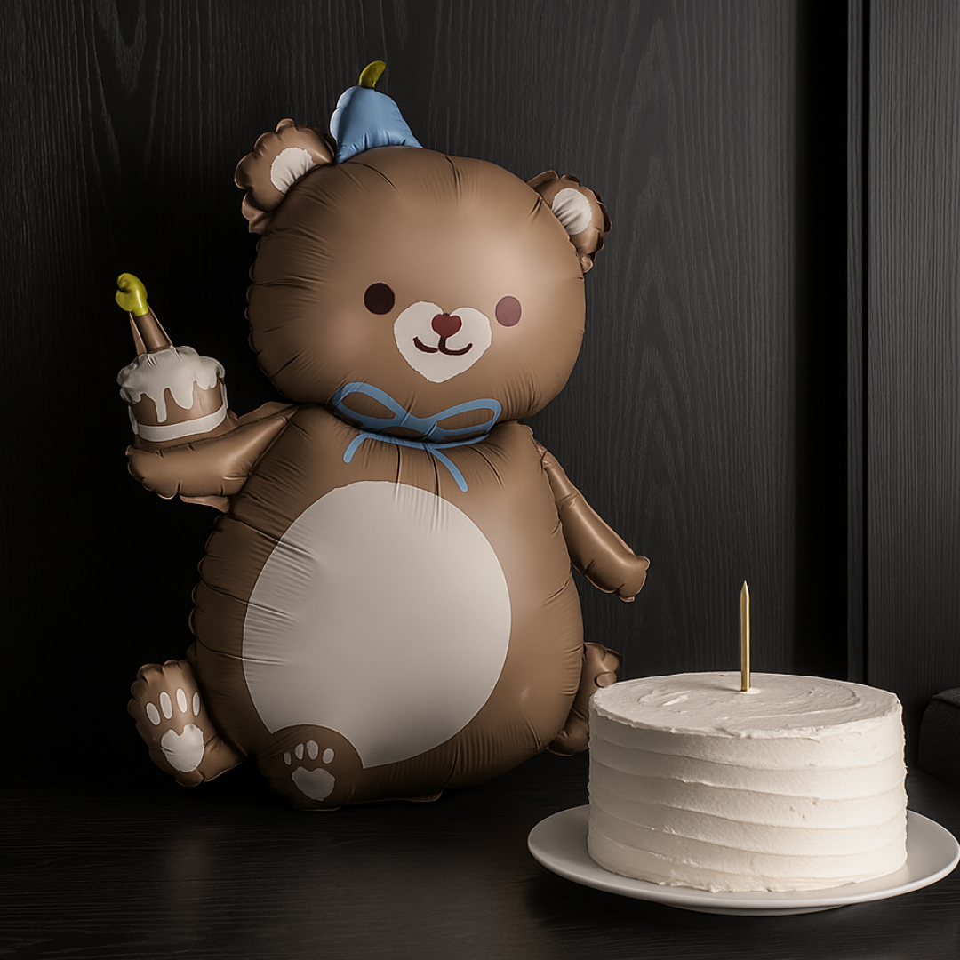 This charming brown bear is the perfect companion for a first birthday, baby shower, or toddler party. It holds a cute cupcake and wears a festive party hat, making it ideal for photo props and table decor.